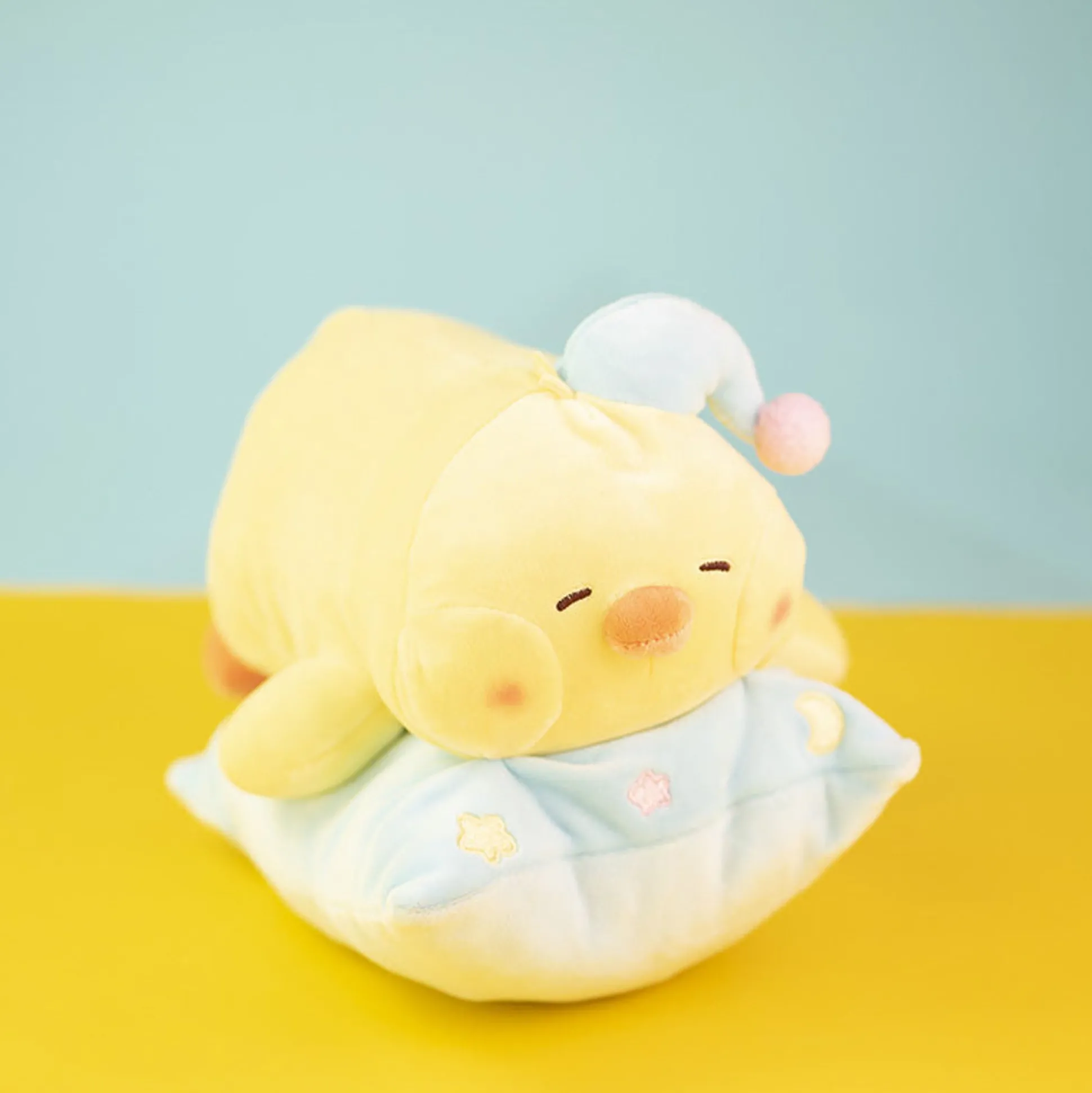 Peluche Pulcino Bibi Che Dorme Su Cuscino Azzurro Con Cappellino Lungo Azzurro.