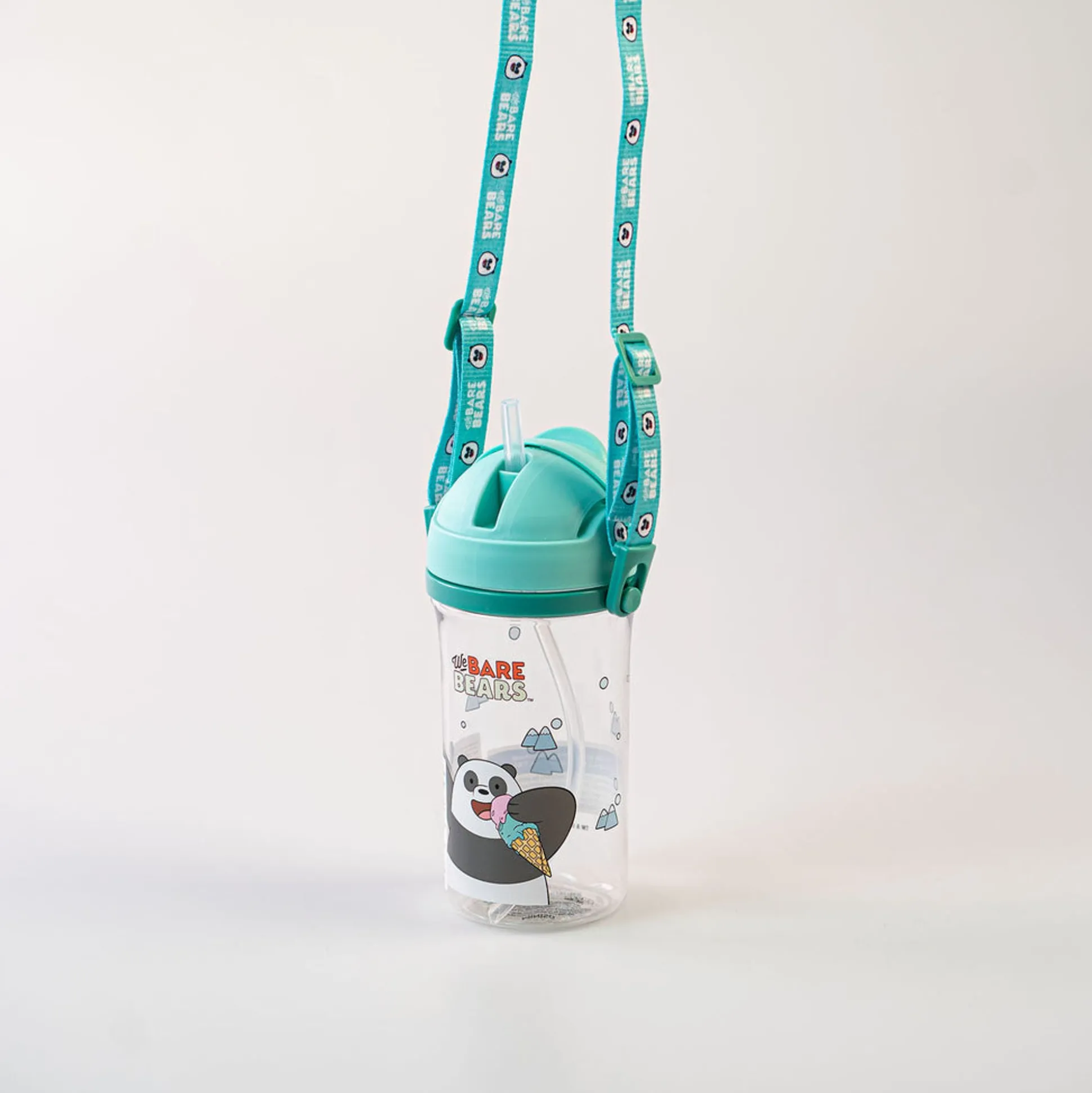 Borraccia We Bare Bears – Panda. Borraccia Trasparente E Verde Acqua Con Tracolla Regolabile E Cannuccia A Comparsa Sul Tappo.