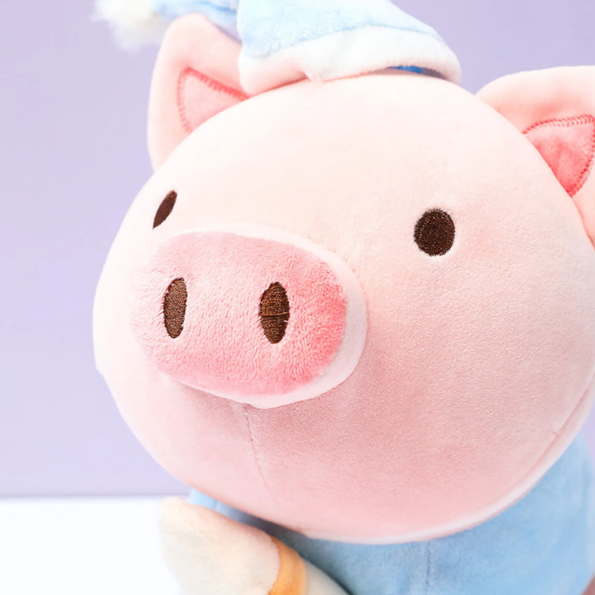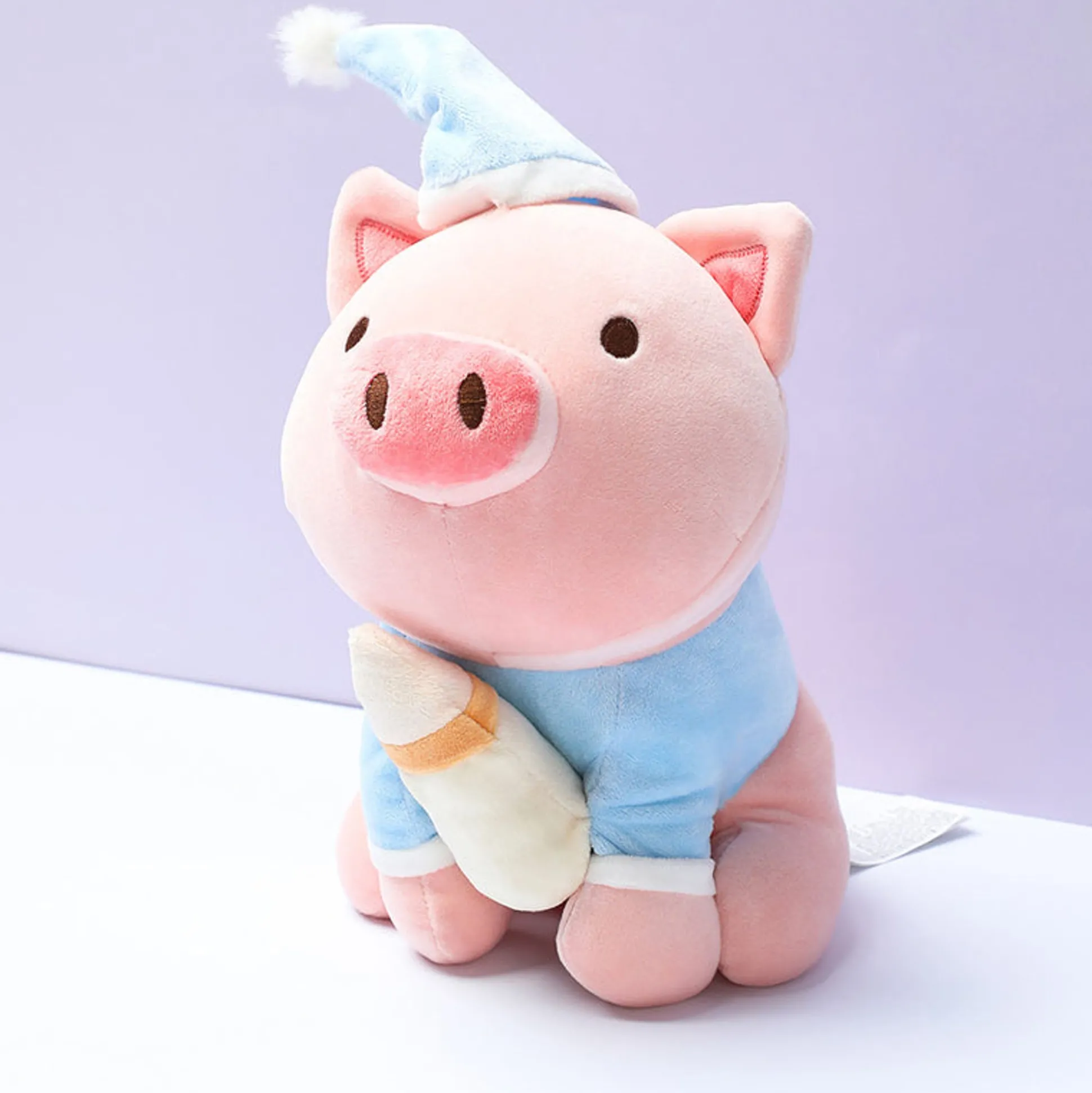 Peluche Maialino Bibi Con Pigiama E Cappellino Azzurro E Bottiglietta Di Latte.