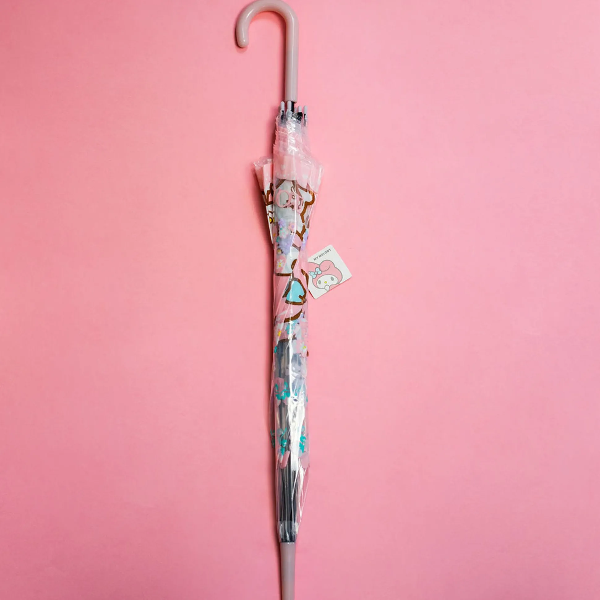 Ombrello Grande Trasparente Con Manico Rosa E Disegni My Melody Della Collezione Sanrio.