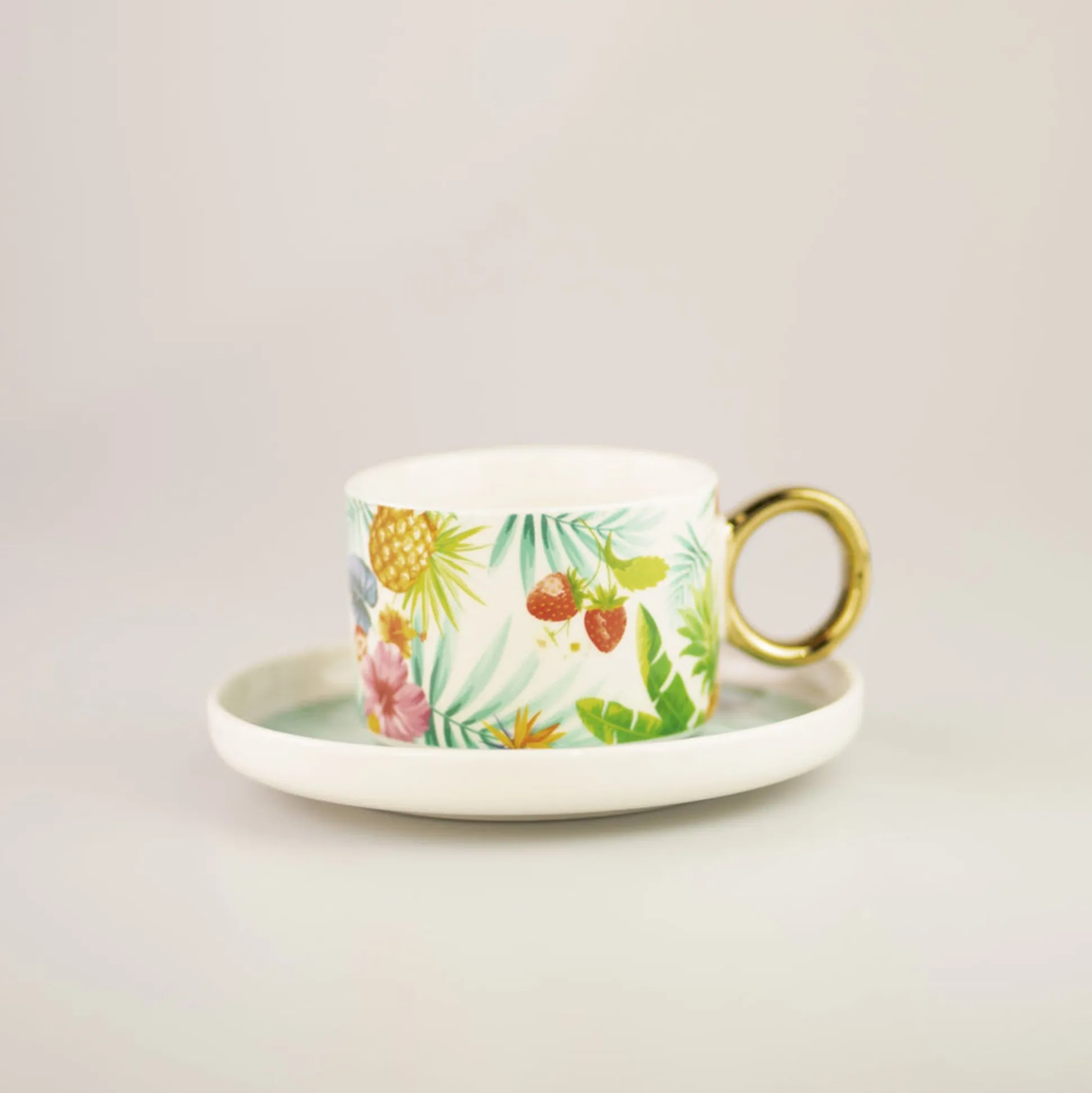 Il Manico In Oro Rende La Tazza Con Fantasie Tropicali Molto Elegante.