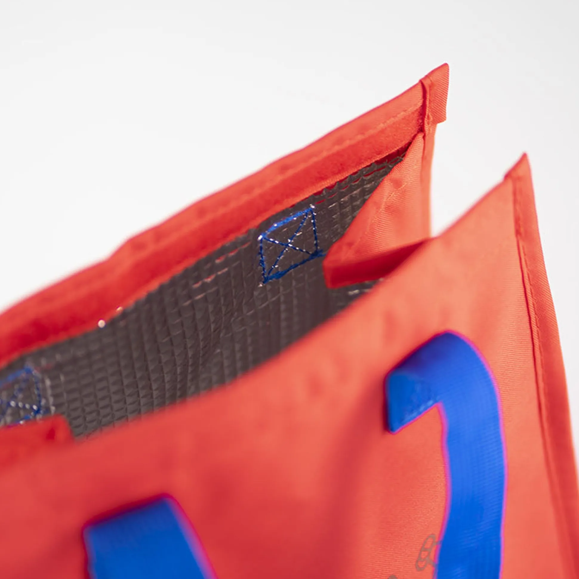 La Borsa Rossa Con Manici Blu Presenta Una Chiusura A Strappo.