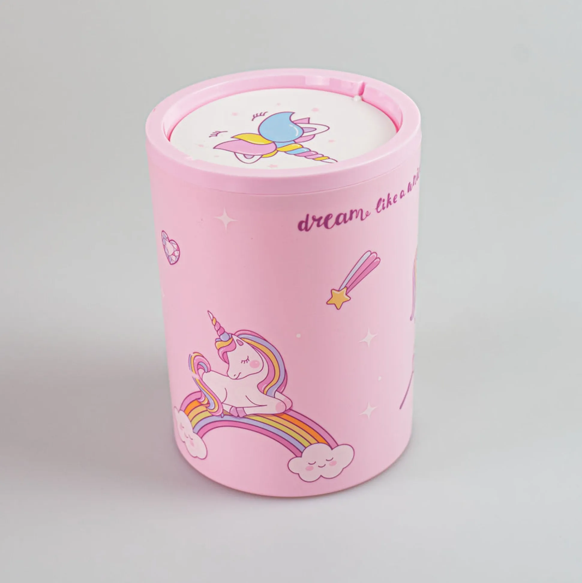 Il Cestino In Color Rosa Presenta Vari Disegni Di Unicorni Ed Un Coperchio Rotante.
